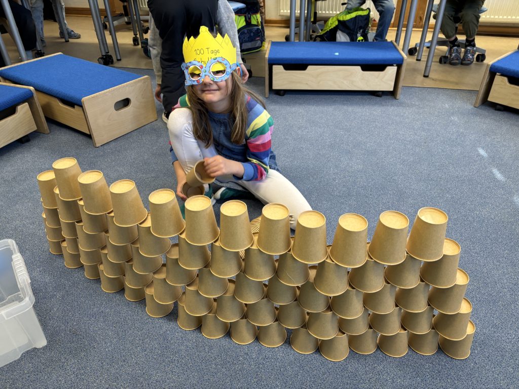 Es wurden 100 Erbsen und Knöpfe gezählt, Türme mit 100 Bechern gebaut, Brillen und Kronen gebastelt und noch vieles mehr. Alle Kinder hatten sehr viel Spaß und freuen sich auf noch ganz viele weitere Schultage ☺️
