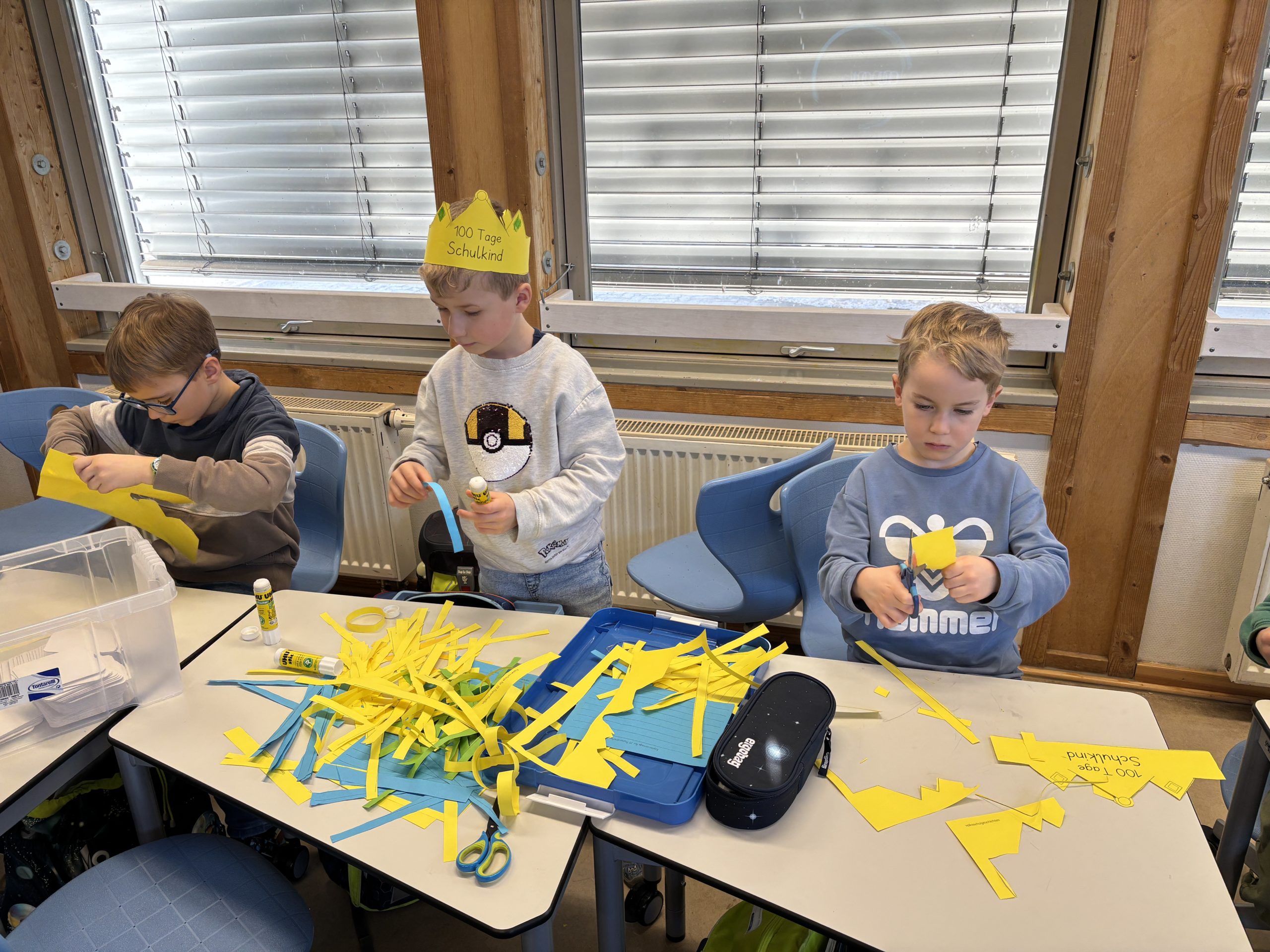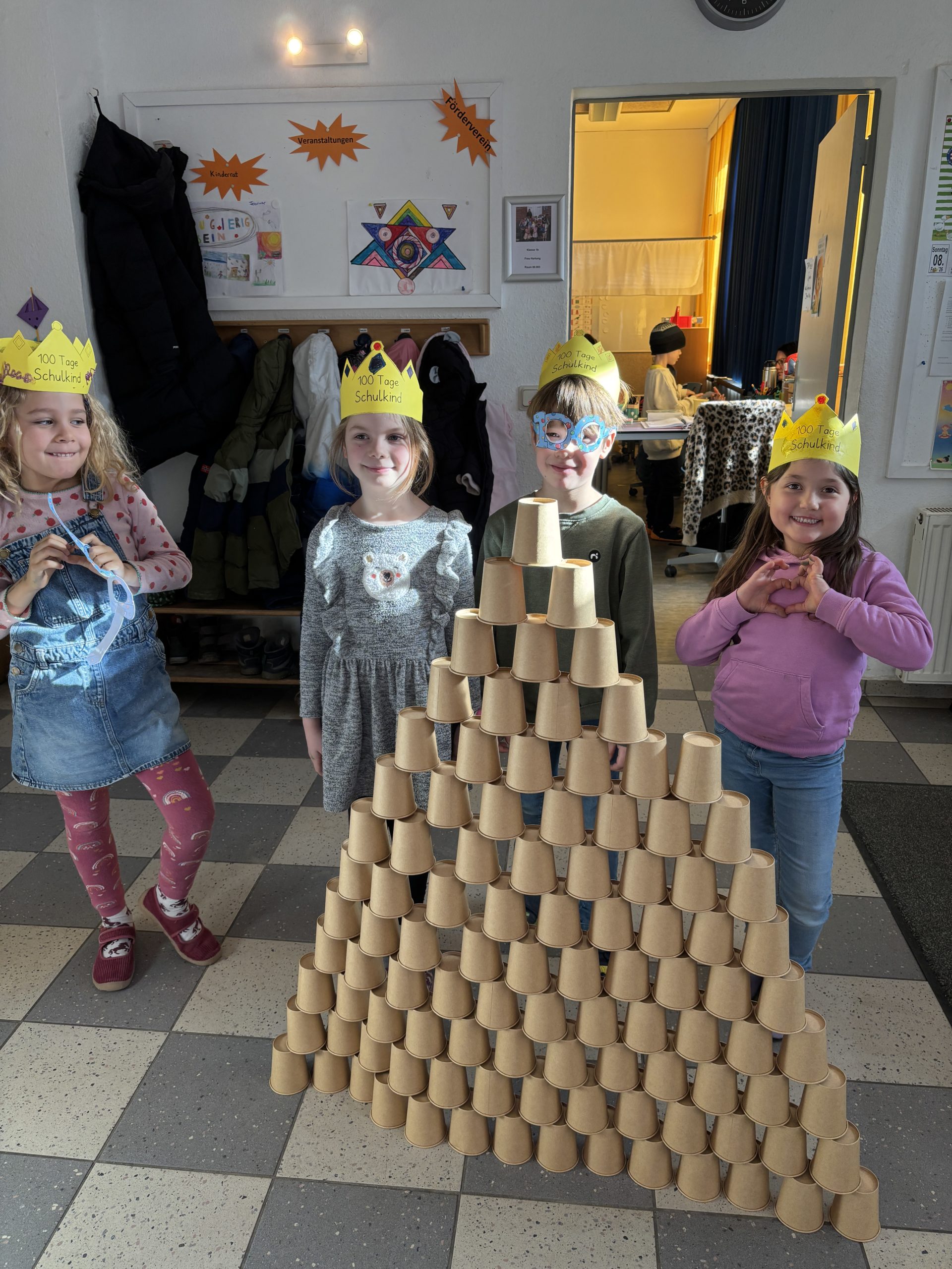 Es wurden 100 Erbsen und Knöpfe gezählt, Türme mit 100 Bechern gebaut, Brillen und Kronen gebastelt und noch vieles mehr. Alle Kinder hatten sehr viel Spaß und freuen sich auf noch ganz viele weitere Schultage ☺️