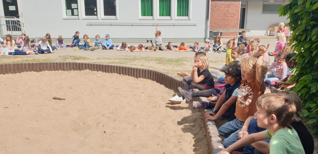 Alle Schülerinnen und Schüler unserer Schule haben sich mit dem Kollegium auf dem Schulhof zu einer Kinderversammlung versammelt. Das war für viele etwas ganz Neues, da derartiges unter coronabedingten Vorgaben lange nicht möglich war. Es wurden viele Dinge erklärt und besprochen. Zum Beispiel, wie die Ausleihe im Spieleschuppen funktioniert und welche Wege auf dem Berg genutzt werden sollen.